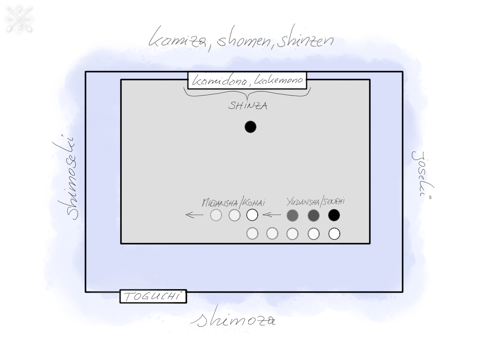Students (deshi) who are already advanced, i.e. graduated (at least 1st dan/shodan) (yudansha; 有段者), as well as those who are generally regarded as senpai (simplified: older, more experienced; 先輩) always tend to sit on the joseki side of the dojo, while the less experienced, ‘younger’ students (kohai; 後輩) or ungraded beginners (mudansha; 無段者) tend to sit on the opposite side (shimoseki) in descending order of rank. This also applies to the areas at the edge of the mat when entering/leaving; kohai and mudansha tend to do so at shimoseki, while senpai and yudansha tend to do so at joseki.